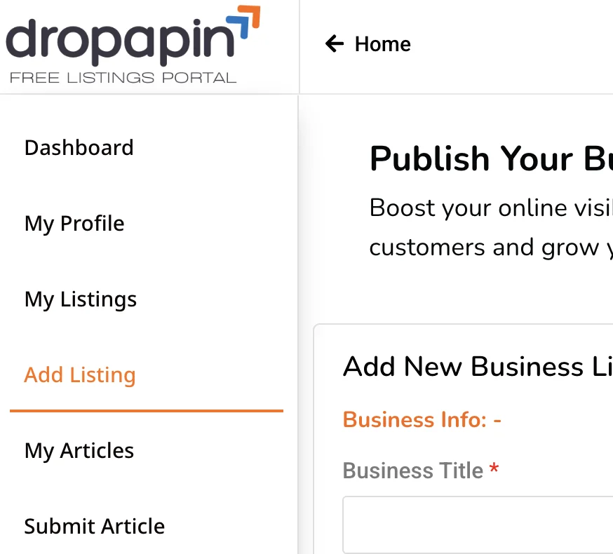 Creating a business listing on directory portal is easy. Click on Add listing button to Register an account and verify your email id. Login to Your account.